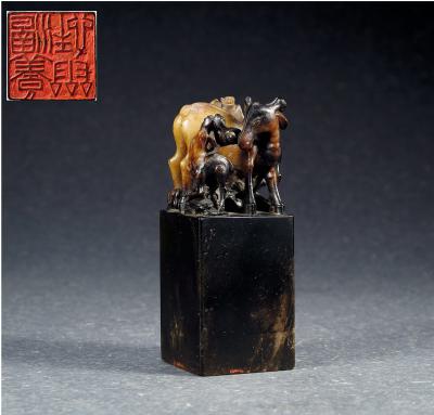 说明: 闲章为寿山石质,钮雕福禄纹饰。钮上以立体圆雕、透雕工艺雕琢福禄纹饰。其主体是一只梅花鹿,呈扭首站立状,双后腿蹬地而直立,鹿尾巴短小可爱,后半身借黄褐石色作为梅花鹿身体,鲜艶亮丽,身上满琢梅花斑纹,鹿前半身向右扭转回首,鹿角翘起,头微下垂,双眼微合,神态安静,慈祥可爱,其头右转而口衔灵芝。此只梅花鹿为主体之外,还有两只小鹿依附其旁。一只小鹿位于大鹿左侧,侧向而立,昂首向上,口衔灵芝草,呈欢腾跳跃状,其前一处假山奇石林立。大鹿右侧空间,在地上置一块山石,另一只小鹿站立其上,扭头向上,与大鹿共衔灵芝草。除三只梅花鹿之外,在大鹿的背部,一只蝙蝠从天而降,栖于其上,蝙蝠与梅花鹿寓意“福禄”,而鹿衔灵芝草又为富贵吉祥之寓意。印钮以下之印章主体,石色黝黑深沉,阴面刻阳文“涵养性灵”四字,为文人闲章。此闲章选料精良,印钮工艺复杂,纹饰生动活泼,寓意吉祥,而印文则超脱天然,实为文人所用、书房所置之闲章佳品。