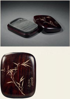 拓片题跋: 是砚石出江西婺源龙尾山眉子坑,为子石。砚作楕圆门字式,眉纹贯穿砚面砚背,甚稀有。砚盒由浴桐小馆主人任重君绘墨竹图,汪志良精心镌刻,乃成佳品。甲午秋日,徐云叔记于申城。钤印: 徐氏 云叔