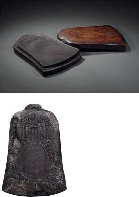 说明: 砚以端溪佳石作成钟形,夔龙钮,浅开砚堂,堂边起阳线,边饰回纹,背以云纹为饰,用刀流畅,雕工清雅,石美工良,得者宝之。配红木砚盒。