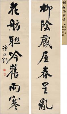 签条: 谭组安行书。七言联(上、下),显初珍藏。