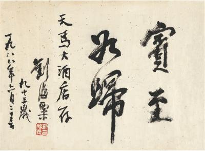 款识: 天马大酒店存,刘海粟九十三岁,一九八八年二十三日。
