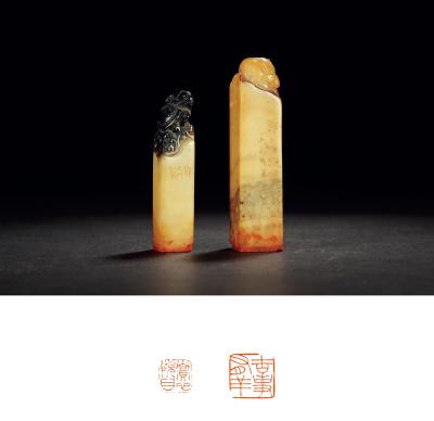 TWO ENTERTAINING SHOUSHAN STONE ‘BEAST’ SEALS ENGRAVED BY DENG DACHUAN