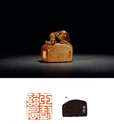 印文: 玉树临风 边款: 西凤。 QING DYNASTY A ‘PEACH’SEAL ENGRAVED BY PAN XIFENG 尺寸: 4.1×4×4.9cm 估价: 30,000-50,000 元 作者简介: 潘西凤(1736~1795),字桐冈,号老桐、天姥山樵,新昌人。王虚舟弟子,久居扬州,精于刻竹以浅刻见重。郑板桥称他的技艺为濮仲谦之后,金陵派竹刻第一人。