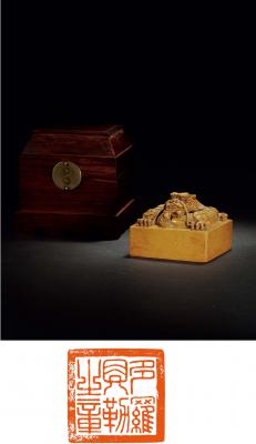 说明: 此印印身光素而短,印面硕大而近正方形。盘龙钮为清代宫廷宝鉨典型钮式之一,龙首高昂,龙爪粗壮有力,麟细密栉比,神态威严,宝气十足。印面粗朱文,粗框,篆字规矩,似以琢玉法刻成。多罗贝勒,原为满族贵族称号,即金代“勃极烈”的异译。清建国后,成为宗室封爵名,全称为多罗贝勒。顺治六年规定,亲王一子封亲王,余子封郡王。郡王一子封郡王,余子封贝勒。