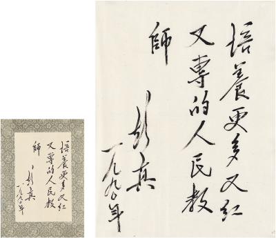 说明: 此为彭真为某高校校庆时题辞之原稿,附该校纪念刊刊印题辞出版物一页。