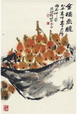 识文: 金橘无酸。乙丑夏仲画于上海梅花草堂。朱屺瞻时年九十四。
