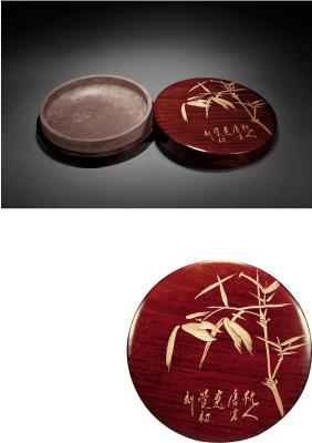 说明: 端石色紫。有火捺数枚。此砚为圆形墨海,浑然大气。适合于擘窠大书。圆“派生天地万物本源,总天地万物之理”,折射古人哲思。配唐云画竹,沈觉初刻木砚盒。
