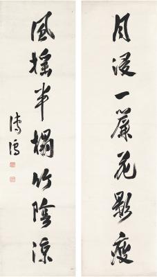 纸本 对联 识文: 月浸一帘花影瘦,风摇半榻竹阴凉。 款识: 溥儒。 钤印: 溥儒之印(白) 心畬(朱) PU RU SEVEN-CHARACTER COUPLET IN RUNNING SCRIPT Ink on paper, couplet 尺寸: 146×40cm ×2 估价: 80,000-120,000 元