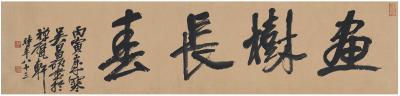 纸本 镜片 1926年作 识文: 画树长春。 款识: 丙寅岁寒,吴昌硕书于禅甓轩,时年八十三。 钤印: 安吉吴俊章(白) 吴昌硕(朱) 虚素(朱) WU CHANGSHUO CALLIGRAPHY IN RUNNING SCRIPT Ink on paper, mounted Dated 1926 尺寸: 138×32.5cm 估价: 600,000-900,000 元