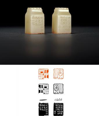QING DYNASTY A PAIR OF WHITE SHOUSHAN ‘FURONG’ SEALS FOR HE CHENG’S PRIVATE USE ENGRAVED BY ZHAO ZHIQIAN