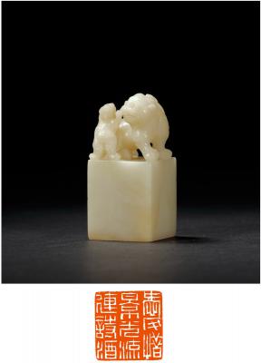 印文: 爱惜景光流连诗酒 QING DYNASTY A WHITE SHOUSHAN ‘FURONG’ STONE ‘BEAST’ SEAL 尺寸: 2.9×2.9×6.3cm 估价: 20,000-30,000 元