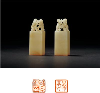 印文: 1.刘志汤印 2.景亳 QING DYNASTY A PAIR OF SHOUSHAN ‘FURONG’ STONE ‘DOUBLE-DRAGON’ SEALS 尺寸: 2.3×2.3×6.5cm ×2 估价: 35,000-50,000 元
