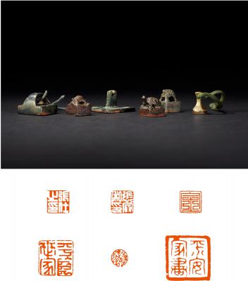 印文: 1.平安家书 2.天隐世家 3.张最私印 4.张仕之印 5.宝 BETWEEN SONG AND QING DYNASTIES SIX BRONZE SEALS 尺寸: 尺寸不一 估价: 10,000-20,000 元