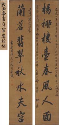 款识: 道光四年嘉平月醉司命之夕,余自淮浦风雪归舟小留城,曲承梦芗友兄,以写翠楼楹帖属书,弱腕冻蝇,辞不获已,灯窗拈笔,聊博玉台双笑何如,书乐园扫花人改琦并识。
