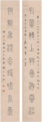 纸本 对联 1944年作 识文: 引莺转上林鱼游灵沼,被鹤飞深谷猿啸高岩。 款识: 书弇山居士集宋人柳永满朝欢、汪莘沁园春词句,应志芳先生法家之属即希正腕。阏逢涒滩闰四月既望,福厂王禔。 钤印: 王褆私印(白) 福厂六十岁后所书(白) Ink on paper, couplet Dated 1944 尺寸: 132×20.5cm ×2 估价: 60,000-80,000 元