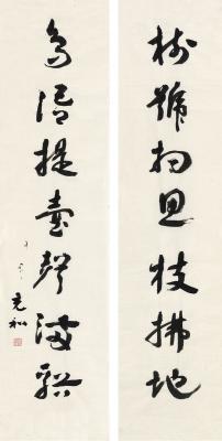 纸本 对联 识文: 树号相思枝拂地,鸟语提壶声满溪。 款识: 充和。 钤印: 张充和(白) ZHANG CHONGHE LU GUIMENG’S COUPLET Ink on paper, couplet 尺寸: 101×25.5cm ×2 估价: 30,000-40,000 元