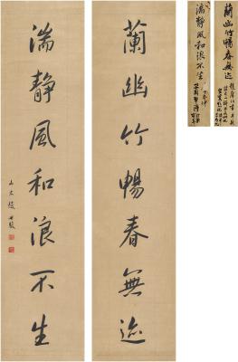 签条: 兰幽竹畅春无迹,湍静风和浪不生。赵声伯书单款,前有一联不及此也。坚叟题记,时年七十有九。庚子冬仲,以十圆币得于荣宝斋。