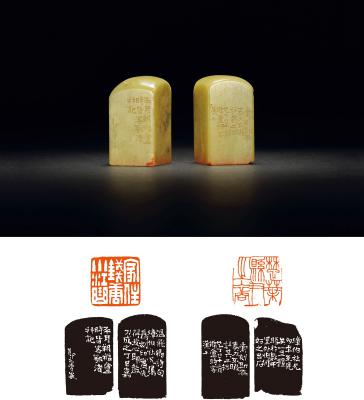 A PAIR OF QINGTIAN STONE SEALS FOR YE XIMING'S PRIVATE USE ENGRAVED BY WANG TI