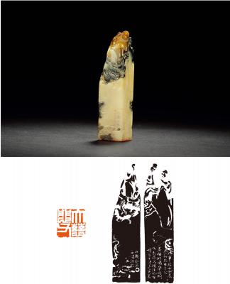 AN ENTERTAINING SHOUSHAN STONE ‘ARHAT’ SEAL ENGRAVED BY WANG RENFU