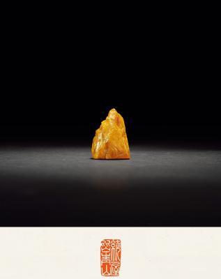 说明: 田黄石是寿山石中的精品,珍贵异常,偶有所获皆奉若珍宝。此方田黄石章形如小山,石质细润凝腻。作者依石形,以高超的薄意技法雕刻一幅山水图卷,青山绿水掩映其间,高士或坐或形,层次分明,意境悠远。