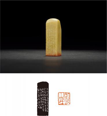边款: 六朝唐文俱尚朱文,文室清雅则有笔意,不可太粗,粗则俗。而神松雪皆镌玉箸,气韵流动,辛巳夏首燕昌作。