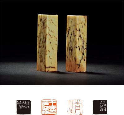 A PAIR OF QINGTIAN STONE SEALS FOR WANG QINGZHI'S PRIVATE USE BY GAO SHIXIONG