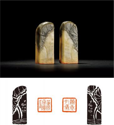 王禔刻寿山石荷塘薄意对章