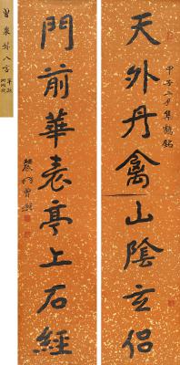 签条: 曾农髯八言联。单款珊瑚笺(上、下)。