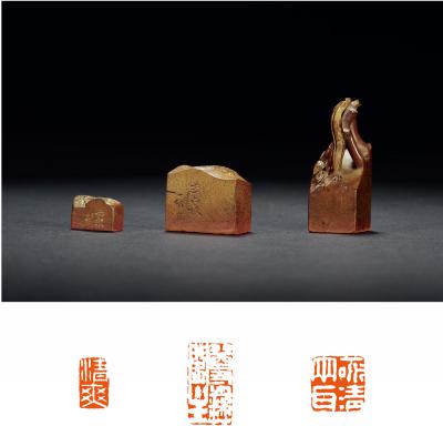印文: 1.清爽 2.尊彝阁主 3.一咏清两耳 边款: 1.西泉刻。 2.西泉刻。 QING DYNASTY THREE BAMBOO ROOT SEALS WITH ‘XI QUAN’ MARK 尺寸: 3.3×1.9×2.9cm 2×1.2×1.4cm 2.2×2.2×5.8cm 估价: 10,000-20,000 元