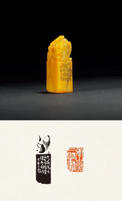 说明: 田黄石出土多呈卵状,故极难有能方正成章者,偶有所成,必为藏家之宝,视若拱璧。此方田黄石章颜色明亮,石质细润,萝卜纹及红筋等特征清晰显著。印章方正有度,印身光素,上雕凤纹。凤参夔龙法雕成,线条刚直有力,简洁流畅,十分祥瑞。