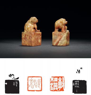 QING DYNASTY A PAIR OF SHOUSHAN STONE ‘BEAST’ SEALS ENGRAVED BY ZHONG YIJING