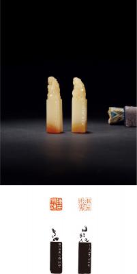 清·胡镢刻寿山芙蓉石子母兽钮对章