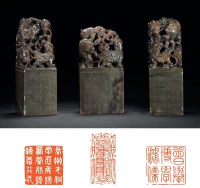QING DYNASTY THREE SHOUSHAN ‘NIUJIAODONG’ STONE ‘LION’ SEALS FOR YOU TONG’S PRIVATE USE