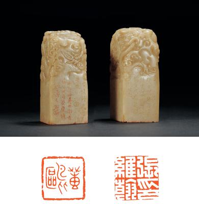 A PAIR OF SHOUSHAN STONE ‘DRAGON AND CLOUD’ SEALS ENGRAVED BY WU SHAOLIN FOR ZHANG WEIHAN’S PRIVATE USE