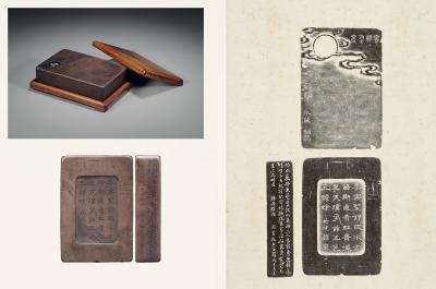 说明: 砚为端石制,长方形,规整厚实,正面浅雕流云朗月,雕工浑茫而灵动,以月为池,旁铭篆书“云根月窟”四字,砚堂微凹以承墨,砚堂左下铭隶书“水英”二字并“神品”小印,砚背覆手内有朱彝尊隶书铭文,书刻俱佳。石色紫,细润而纯净,为端溪上品佳石。配红木天地盖。