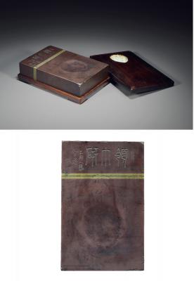 说明: 祁阳砚产于湖南祁阳,此砚石色红紫,砚上端有一苍绿色石层,如人配领巾,故名领巾砚。砚规整方正,厚重大气。配红木嵌玉天地盖。