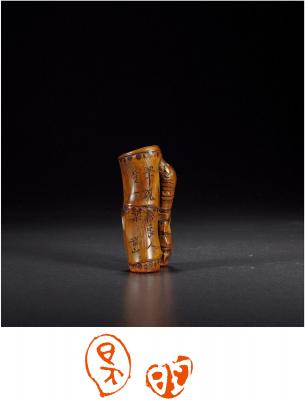 印文: 明、是 边款: 1.笔砚精良,人生一乐。学山。 2.古今有之。 QING DYNASTY A BAMBOO ROOT SEAL INSCRIBED BY XUE SHAN 尺寸: 高:8cm 估价: 15,000-20,000 元