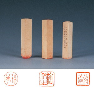 印文: 1.葆华 2.陶叔之 3.蒋有昶 边款: 1.庚寅元月福厂。 2.乙酉九月福厂。 3.丁丑冬日仿秦人印奉旭庄先生法正福厂居士。 尺寸: 直径:1.1cm 高:6.2cm 1.2×1.2×6.1cm 1.1×1.1×5.8cm