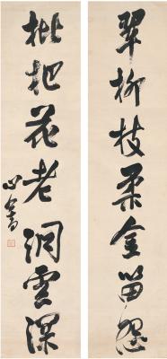 纸本 对联 识文: 翠柳枝柔金笛怨,枇杷花老洞云深。 款识: 心畬。 钤印: 心畬(朱) PU RU SEVEN-CHARACTER COUPLET IN RUNNING SCRIPT Ink on paper, couplet 尺寸: 129×29cm ×2 估价: 50,000-80,000 元