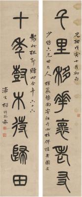 款识: 光绪戊寅十月初旬,少鹤六兄世大人权篆曹南寄牡丹四株,俾植老圃,余制此联却赠。时余年六十六。濠叟杨沂孙篆。