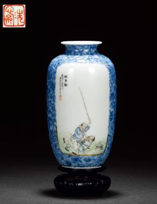 REPUBLIC OF CHINA A BLUE-AND-WHITE FAMILLE ROSE BOTTLE WITH FIGURE PATTERN PAINTED BY WANG QI