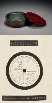 说明: 绿端为端石中之稀有砚材,石质细腻纯洁,色泽青绿纯正。此砚以绿端石作圆形单打砚,圆正大方,墨池深广以利蓄墨,工艺精致,线条圆美,不落旧俗,砚背仿汉瓦当样式雕“仁义自成” 四字。石色碧绿润泽,质地细腻而有锋,藏用俱佳。配红木天地盖。