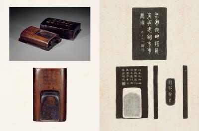 砚盒铭文: 右军池畔摇龙尾,坡老铭中串凤珠。阳山陈炳。印文: 陈炳之印 虎文