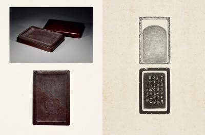 QING DYNASTY A RECTANGULAR DUAN INKSTONE AND A MAHOGANY CASE, INSCRIBED BY JING RIZHEN
