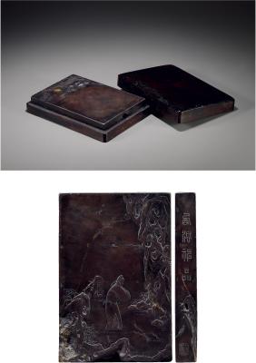 说明: 砚为端石,长方,浅雕梧桐纹,环以流云纹,并以云纹回环成砚池。云纹间有石眼数颗,大眼借为明月,小眼如星,立意清幽。砚背浮雕米芾拜石图。石色紫,纯净细腻,为端石中上品。配红木砚盒。