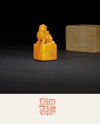 说明: 因为田黄的稀少,能成方章者更是稀见。此田黄石古兽钮章,包浆细润油亮,石质细腻莹润,微成冻,抚之如小儿肌,极为可人。肌理之下,萝卜纹清晰可见,田黄特征明显。印身上雕古兽为钮,古兽朴茂的造型,背颈出须麟宛然,细致入微。置之案头,祥气丛生。