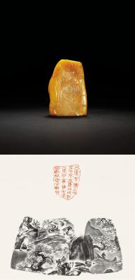 说明: 此方杜陵石章颜色明亮,黄中带透,石质细润凝腻。作者随形雕绘商山四皓,以薄意方式表达传统中国画题材。线条流畅简洁,人物形态、神情刻画细致有风韵,构图层次分明,赏之意境悠远。具有典型的林清卿作品特征。