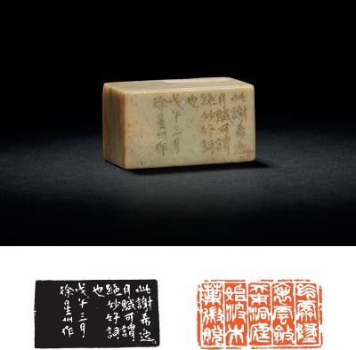 AN ENTERTAINING QINGTIAN STONE SEAL ENGRAVED BY XU XINZHOU