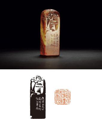QING DYNASTY A LIGHTLY CARVED SHOUSHAN STONE SEAL WITH LANDSCAPE PATTERN ENGRAVED BY WU GAO