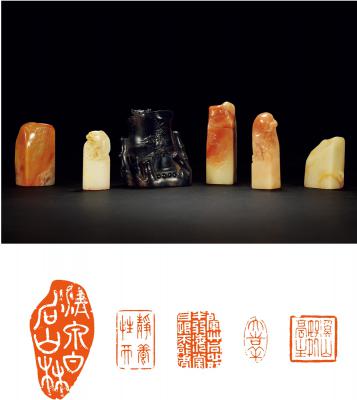 印文: 1.清泉白石山林 2.静养性天 3.兰草同心多半弱,海棠自恨不能香 4.大吉祥 5.溪山好处亭主 SIX SHOUSHAN STONE SEALS 尺寸: 6.6×3.1×6.7cm 3×2×4.5cm 2.9×2.2×5.5cm 2.4×2.4×7.3cm 1.9×1.9×6.6cm 2.3×1.2×5cm 估价: 20,000-30,000 元